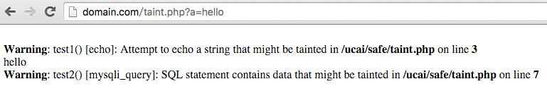 因为我们安装了 php-taint 模块,运行这段代码,程序就会报错提醒我们可能有安全问题(如图1-42)。