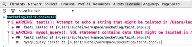 报错直接显示在浏览器会影响网站的界面,如果开发的是 API 会导致输出的不是 json 格式。所以 php-taint 和 SocketLog结合最完美,我们可以把安全报警显示在浏览器的 console 中(如图1-43)。